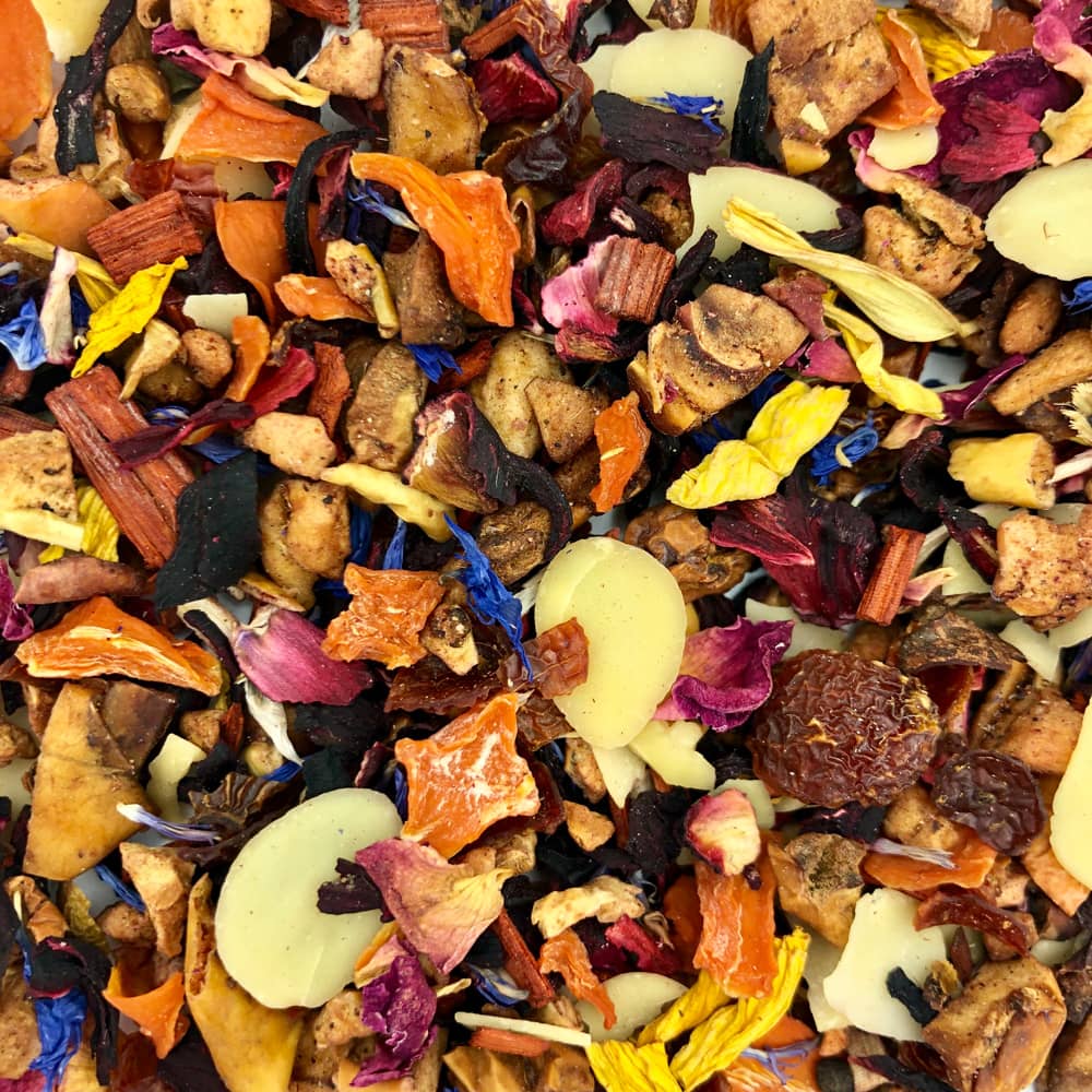 | Zutaten: | Apfel, Hibiscus, Hagebutte, Mandeln, Karotten, Rotsandelholz, Rosenblütenblätter, Kornblumenblüten, Sonnenblumenblüten, Aroma. Kann Spuren von anderen Schalenfrüchten und Erdnüssen enthalten. |