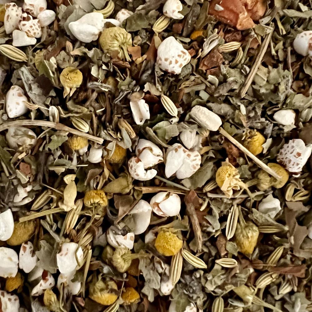 | Zutaten: | Fenchel, Apfelstücke, Buchweizen gepoppt, Brombeerblätter, Anissamen, Zimtstücke, Kamille, Salbeiblätter, Brombeerblätter süß, Aroma. |