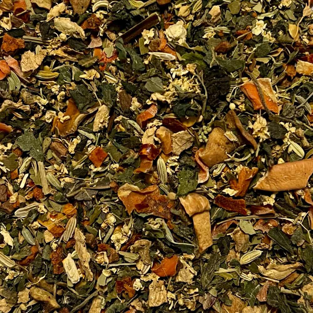 | Zutaten: | Brennnesselblätter, Ingwer, Fenchel, Holunderblüten, Karotten, Mate, Zimt, Chili, Apfel. |