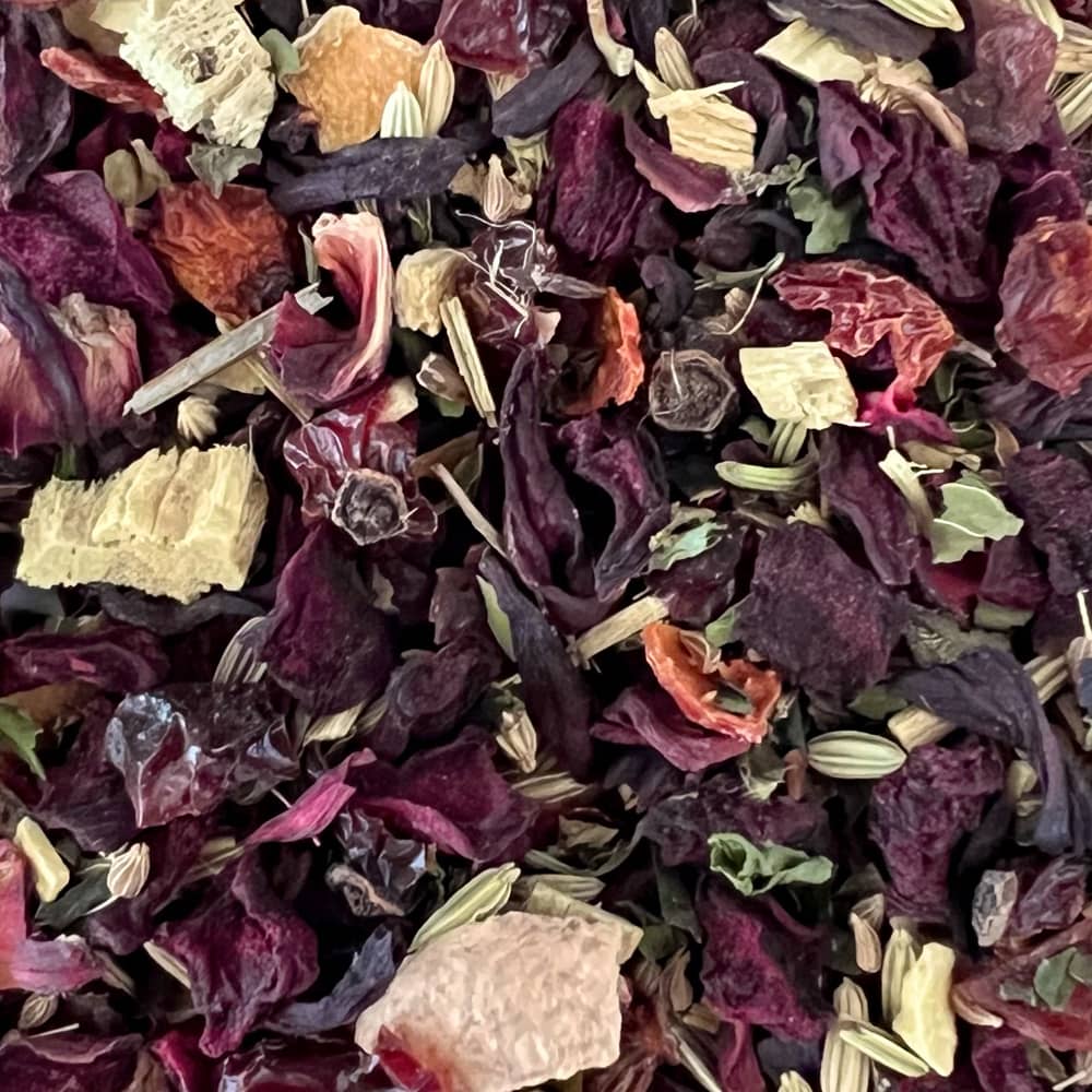 | Zutaten: | Fenchel, Rote Beete, Anissaat, Hagebuttenschalen, Hibiscusblüten, Süßholz, Brennesselblätter, Orangenblüten, Pfefferminze. Enthält Süßholz - bei hohem Blutdruck sollte ein übermäßiger Verzehr vermieden werden. |